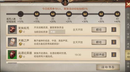 2、一定要加入家族,做完所有家族活动,除拓荒以外的家族活动受家族活跃人数加成,可以稍晚一些再做(也不要太晚,错过了高等级活动得不偿失),家族拓荒尽早完成;