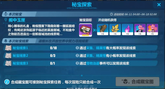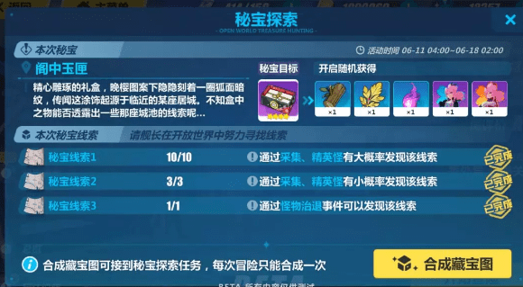 合成藏宝图需要10个秘宝线索1,3个秘宝线索2和1个秘宝线索3。完成怪物退治并且采集完所有物资后能获得非常充足的秘宝线索。