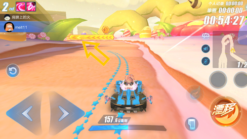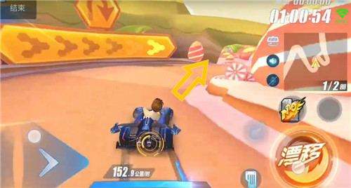 在接近终点的位置有一个M型弯,第二个弯道与近道之间角度偏小、距离较近,漂移时容易发生碰撞。建议在上图位置调整赛车方向,将赛车对准捷径入口平跑通过,若在近道前车头朝向不好可小漂调整。