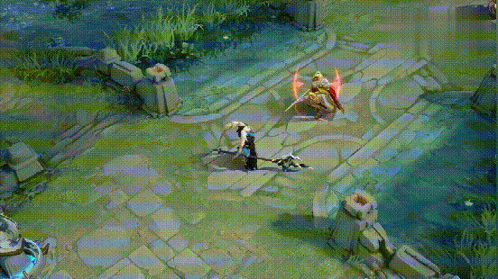 一技能【方天画戟】,挥出时伴随着蓝色的电弧,附魔状态下还会在头顶产生类似三叉戟的蓝色图标。