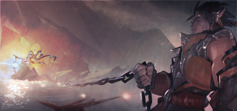 考虑到吴国善水战的历史形象,在孙策的技能包装上我们选择了水浪、波涛。孙策的武器也采用了船锚,为了表现船锚的重量感,孙策挥舞武器的动作经过精心设计,决定手感的前后摇也通过不断调试,希望操作者能够实实在在感受到每一击的重量感。
